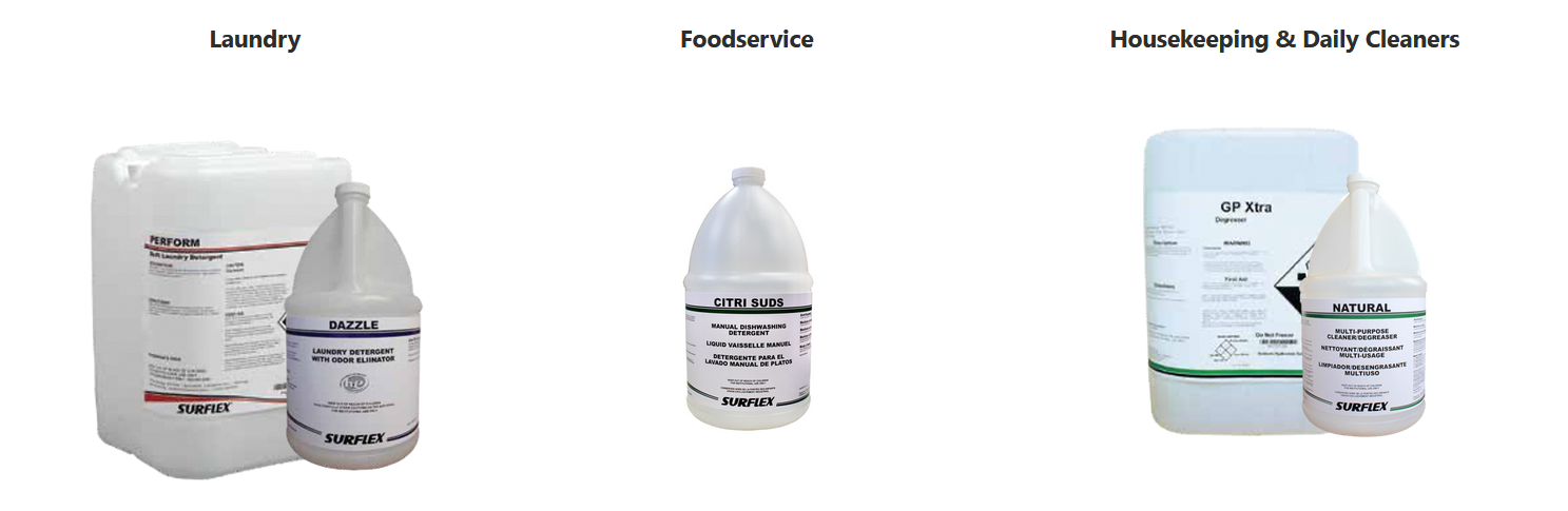 SURFLEX products are made for Laundry, Foodservice as well as Housekeeping and Daily Cleaners Applications. For a complete list of products, talk with your INTEGRA Program representative or contacts us directly:
