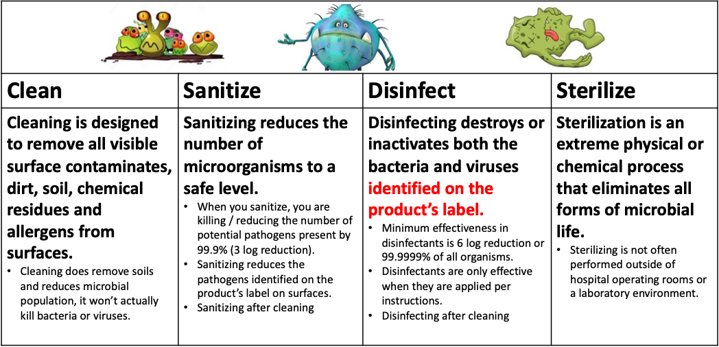 Proper Cleaning, Sanitizing and Disinfecting is essential in reducing the spread of COVID-19