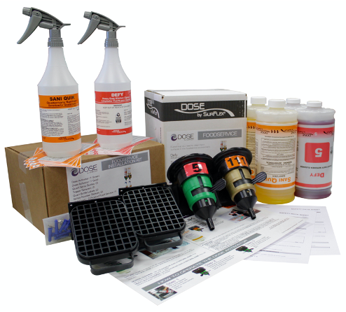The DOSE 2 Product Foodservice Starter Kit includes DEFY Heavy Duty Cleaner and SANI QUIK along with all of the dispensing equipment, spray bottles, wall charts and training aids needed to implement a cleaning and sanitization program in one box! SANI QUIK is a unique 3 in 1 product that can be used as a light duty quat cleaner, and mixed to be a sanitizer or a disinfectant at slightly higher concentration. The Dispensing Equipment included in the starter kit is set up to dispenser at either level, so you can choose to dilute it as a sanitizer or as a disinfectant. We include labeling for the spray bottles in the kit so you can label properly.