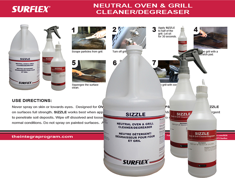 Formulated with a readily biodegradable, high-performance solvent and surfactant system. It will not leave a caustic film. SIZZLE is based on a neutral pH formulation; it cleans comparably to high alkaline formulas, but is much safer to use. No rinsing is necessary under normal conditions.